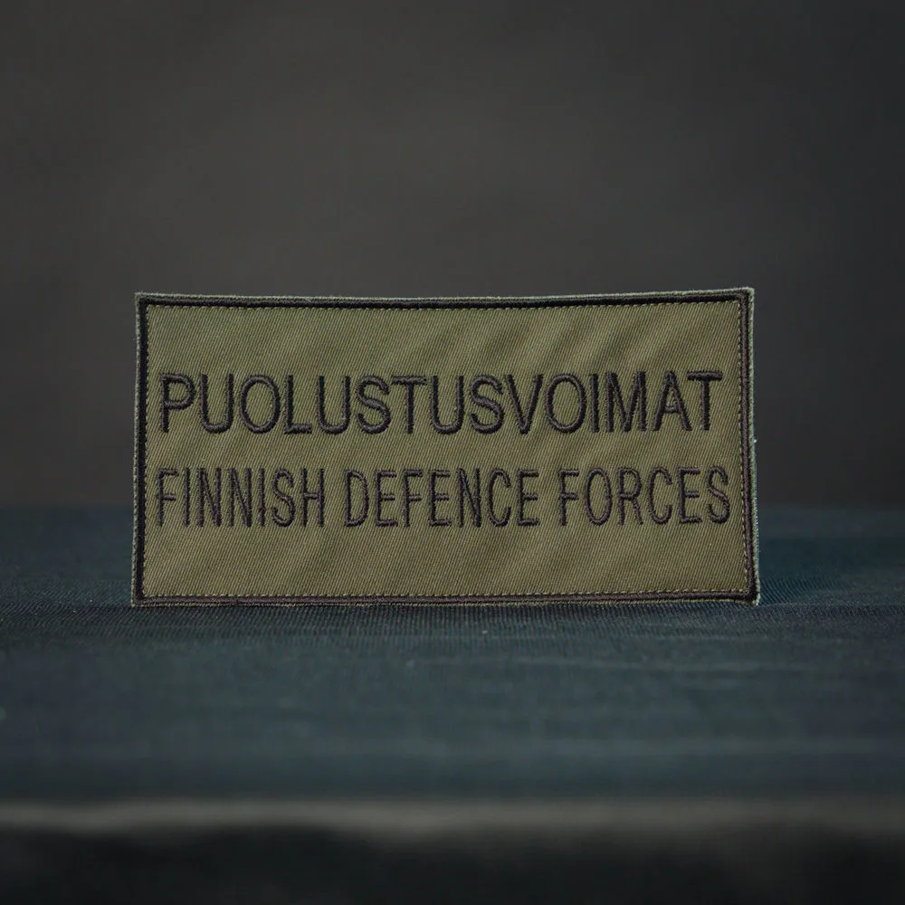 Puolustusvoimat – Finnish Defence Forces -velcromerkki koossa 16 x 8 cm.